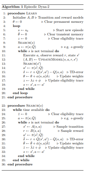 在Dyna算法框架的基础上后来又发展出了Dyna-2算法框架。和Dyna相比,Dyna-2将和和环境交互的经历以及模型的预测这两部分使用进行了分离。还是以Q函数为例,Dyna-2将记忆分为永久性记忆(permanent memory)和瞬时记忆(transient memory), 其中永久性记忆利用实际的经验来更新,瞬时记忆利用模型模拟经验来更新。