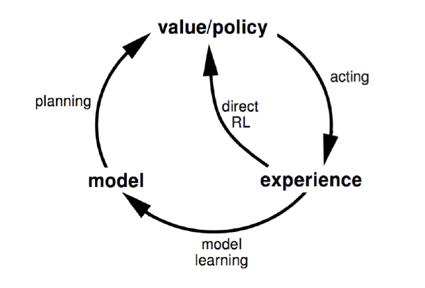 Dyna算法框架并不是一个具体的强化学习算法,而是一类算法框架的总称。Dyna将基于模型的强化学习和不基于模型的强化学习集合起来,既从模型中学习,也从和环境交互的经历去学习,从而更新价值函数和(或)策略函数。如果用和第一节类似的图,可以表示如下图,和第一节的图相比,多了一个“Direct RL“的箭头,这正是不基于模型的强化学习的思路。
