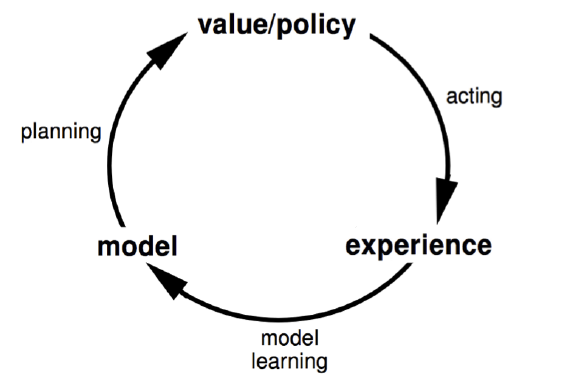 从上面的流程可以看出,Dyna框架在每个迭代轮中,会先和环境交互,并更新价值函数和(或)策略函数,接着进行n次模型的预测,同样更新价值函数和(或)策略函数。这样同时利用上了和环境交互的经历以及模型的预测。