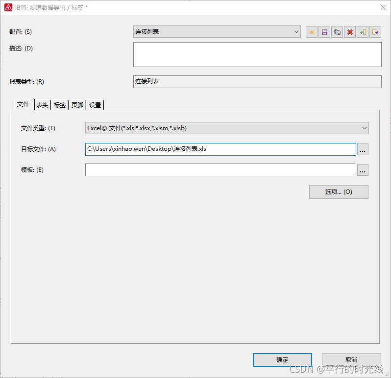 4、此时会弹出配置界面,在文件栏目中的文件类型里下拉菜单,选择excel,并在目标文件一栏输入输出文件的保存地址(全地址);
