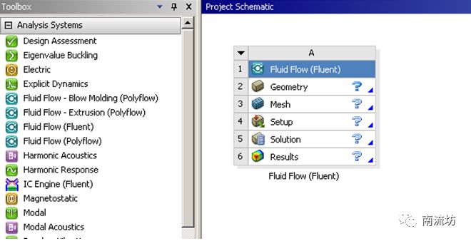 (2)双击主界面Toolbox(工具箱)中的Analysis systems→Fluid Flow(Fluent)选项,即可在项目管理区创建分析项目A。