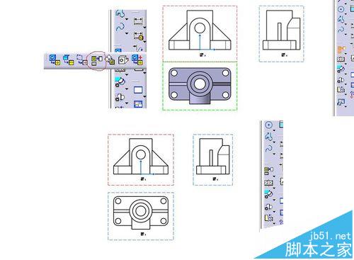 有一点需要注意的就是,请注意图中每个二维图都带有一个虚线框,当你想对视图进行“投影视图”和“偏移剖视图”操作时,务必确保你所要投影的主视图和你想画剖切线的视图虚线框为红色,蓝色虚线框是未激活的视图,当前不可操作。