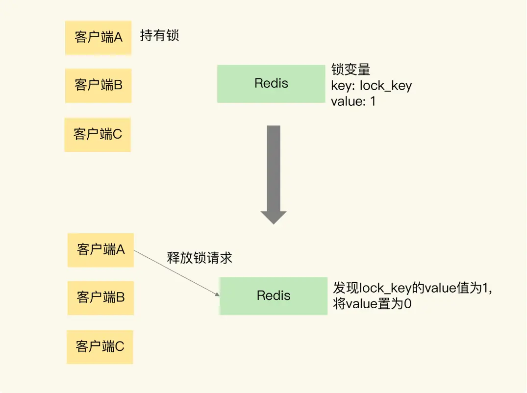 和单机上的锁类似,分布式锁同样可以用一个变量来实现。客户端加锁和释放锁的操作逻辑,也和单机上的加锁和释放锁操作逻辑一致:加锁时同样需要判断锁变量的值,根据锁变量值来判断能否加锁成功;释放锁时需要把锁变量值设置为 0,表明客户端不再持有锁。