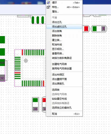 在PCB的空白处,点击鼠标右键,在弹出的快捷菜单栏中先选择“选择网络”命令。鼠标左键选择需要添加虚拟过孔的对应的网络之后,单击鼠标右键,在弹出的快捷菜单栏中选择“添加虚拟过孔”,如图1所示。在需要放置虚拟过孔的地方左键单击去进行放置,如图2所示。