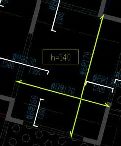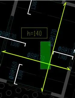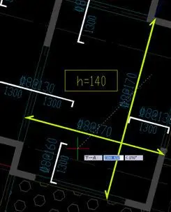 如果现在想将两条绿色的钢筋和标注删掉,房间是斜的,竖着的钢筋跟其他图形挨得比较近,好在图形还不算太密,用框选也可以,不过需要找一个合适的位置,如下图所示。如果对象再密一点,则稍有不慎就会选上其他对象。