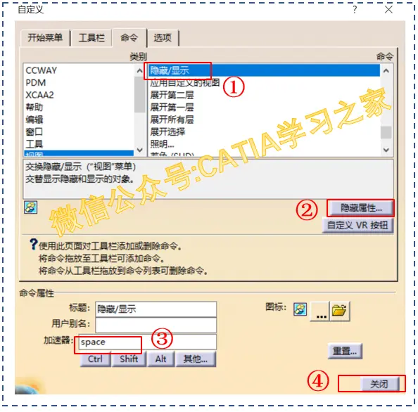 CATIA设计过程中有很多命令使用频率比较高,特别是对 选定对象 的两个操作-【隐藏/显示】【定义工作对象】,对于操作频率比较高的命令,如果使用右击选择或者点击图标的方法,会大大降低设计的效率,常用的方法是将使用频率比较高的命令设置成快捷键。