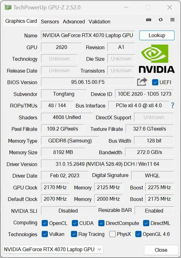 游戏本大家首先最关心的自然是独立显卡了,毕竟钱要花在刀刃上。此次机械师曙光 16 Pro 便选用了【NVIDIA GeForce RTX™4070 笔记本电脑 GPU】,它基于 AD106 核心,拥有 4608 个 CUDA 内核,频率在 2070-2175 MHz,拥有 8GB 128bit GDDR6 显存。基础功耗 115W(搭配 Dynamic Boost 2.0 功耗最高可以达到 140W),支持独显直连 2.0。