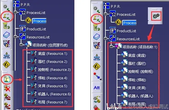 6、创建项目资源节点:方式一:打开装配设计,新建一个装配体空白文档并将其保存在项目Resource(资源)文件夹下面。切换到DPM装配流程仿真工作台模块,在左侧工具栏中点击插入资源命令,将刚创建的装配体文件加载到ResourceList资源节点下面,此装配体文件作为仿真项目的总资源节点,然后使用在PPR中创建资源命令,在它下面创建各类资源节点,如下左图所示。完成后资源节点创建后加载所有的资源模型,然后放置到各自的资源节点下面;