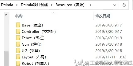 3、资源分类:在Resource(资源)文件夹下面,按下图所示继续创建子类文件夹,将资源进行一一归类,方便查找,一目了然。当然也可以将所有的资源、产品、工艺都放置于同一个文件夹下面,对于项目仿真本身是没有太大影响的,但是这样做会比较乱,当其他项目需要用到本项目中的焊枪资源时,查找就会很头疼,因为所有的资源都在同一个文件夹下面,不便于资源的查找共享,当然也会浪费一部分时间在查找上面,而进行分类之后就不会有这个问题的存在;