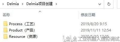 2、项目文件夹创建:了解了以上Delmia仿真软件的结构树和各节点后,下面进行项目文件夹的创建,如下图所示我们创建Process(工艺)、Product(产品)、Resource(资源)3个文件夹和结构树一一对应;