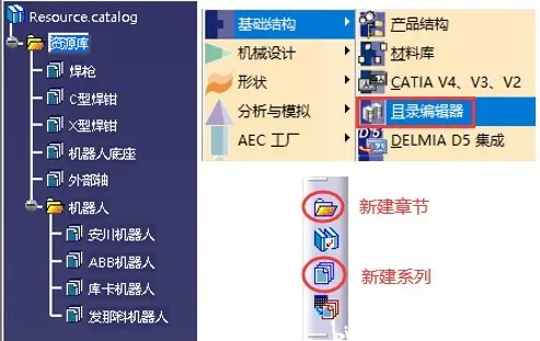 1、资源库文件创建:打开Catia或者Delmia软件,切换到目录编辑器模块,将章节1(文件夹图标)名称修改为资源库,然后保存文件并命名为Resource,此文件将作为资源库文件。在右侧工具栏中选择新建章节和系列命令,按下图所示进行新建并重新命名;
