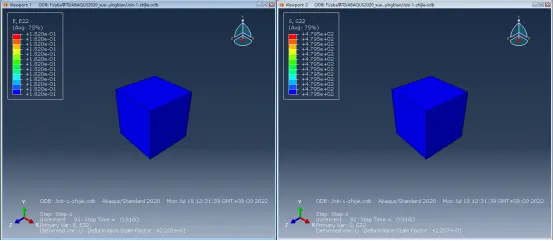 (4)塑性应变PE22云图如下,可见刚好为PE22=E22-EE22=0.2-2.277839e-3=0.197722161。可见比打开几何非线性得到PE22=0.1800要大