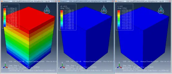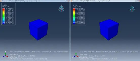 (1)在U2=0.2mm时,此时的总应变分量E22云图如下,可见其值为0.2,刚好与此时的名义应变值0.2/1=0.2相等,在石亦平的《ABAQUS有限元分析实例详解》第167页指出,此时的E为真实应变,按此说法云图显示的E22应等于In(1+0.2)=0.1823,与试验结果不符。但是在查看真实应力值时,S22为输入真实应力-真实应变曲线上真实应变为0.2时对应的应力值,可见ABAQUS在计算应力值时是把E22当作真实应变来对待的。但实际上此时的真实应变值不是0.2,应该为0.1823,总结:此时E22的值为名义应变的值,但是在查找真实应力时将其当作真实应变,可见ABAQUS确实认为E22的值为真实应变,只不过在计算E22值时采用计算名义应变NE22的公式,也就是在小变形的情况下把名义应变当作真实应变来处理。