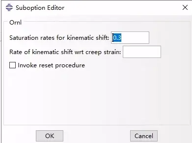 Rate of kinematic shift wrt creep strain :H值 该参数等于相对于蠕变应变的随动改变率。该参数由标准第4.3.2-1节式(7)定义。设H=0.0使用1986年的标准修订版。如果省略此参数,Abaqus将根据1981年版标准的第4.3.3-3节确定H的值。