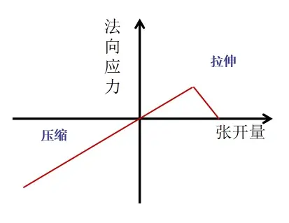 综合上述结果,在粘聚力单元厚度方向上将压缩与拉伸行为绘制到一个图上,就是下图的样子。图中第一象限代表拉伸行为,第三象限代表压缩行为。在拉伸方向上,随着位移的增大,拉伸应力先增大随后发生损伤减小,直至失效。而在压缩方向上,cohesive element始终保持线弹性力学行为而不会发生损伤。