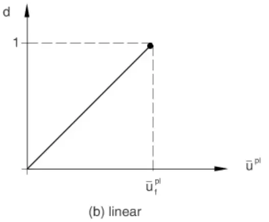 损伤变量随相对塑性位移的演变可以用表格、线性或指数形式表示。当失效时的塑性位移(¯u pl f)为0时,将发生瞬时破坏;但是,不推荐这种选择,应该谨慎使用,因为它会导致材料点的应力突然下降,从而导致动态不稳定。