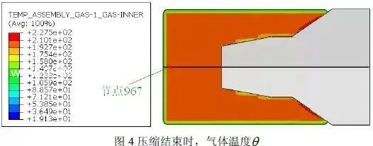 在设置模型过程中,活塞和气体之间的接触通过inp文件的关键字实现,经过实践证明,这样的定义方式可以有效避免气体的泄露。其定义过程为:*******************为气体分配材料属性***********************Initial Conditions, type=VOLUME FRACTIONSet-inner-gas, gas-1.gas-inner, 1.******************定义气体的欧拉接触面*********************Surface, type=EULERIAN MATERIAL, name=inner-gassurfacegas-1.gas-inner******************定义活塞和气体之间的接触*******************Contact Inclusionsinner-gassurface,Surf-contact-huosai***************************************************通过仿真计算后,在压缩结束时刻,气体的压强和温度如图3和图4所示。