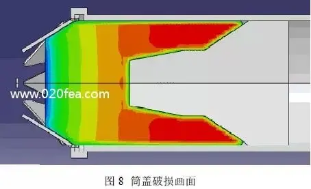 脆性材料采用Brittle Cracking的失效准则,模拟出筒盖破损的状态如图8所示。