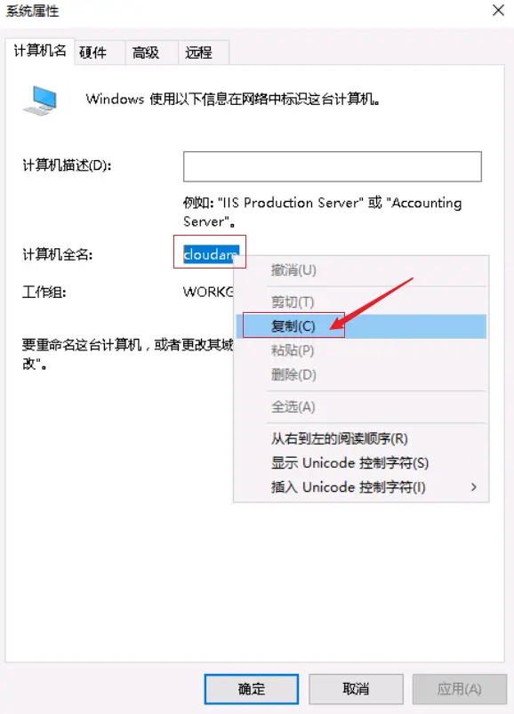 33.选中【计算机全名】后的内容,然后鼠标右击选择【复制】
