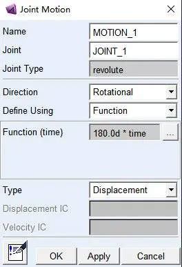 选择上侧的大齿轮为驱动,如图3所示,对轴与地面之间的转动副创建旋转驱动,驱动函数为180d*time,如图4所示。
