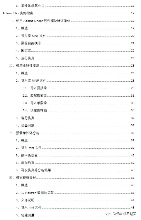 本教程讲述了构建柔性体模型和Adams Flex实例两大部分,通过本教程学习能够深入了解Adams Flex模块的功能,学会如何进行柔性体检查和验证,目录截图示例如下: