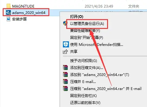 ☉17.打开安装包解压后的【Adams2020(64bit)】文件夹,鼠标右击【adams_2020_win64】选择【以管理员身份运行】。