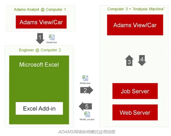 然后,设计工程师利用该Excel表格模型,进行相应的模型、工况和求解参数修改,并配置Web服务器信息,利用Excel集成的ADAMS插件将作业进行提交。Web服务器会通过Job Server调用Adams求解器进行计算。