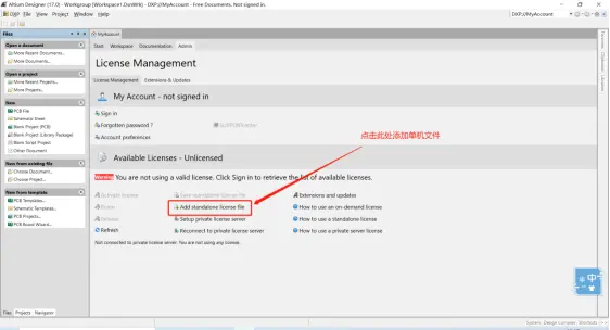 第三步、如下图点击方框内“添加单击许可文件”
