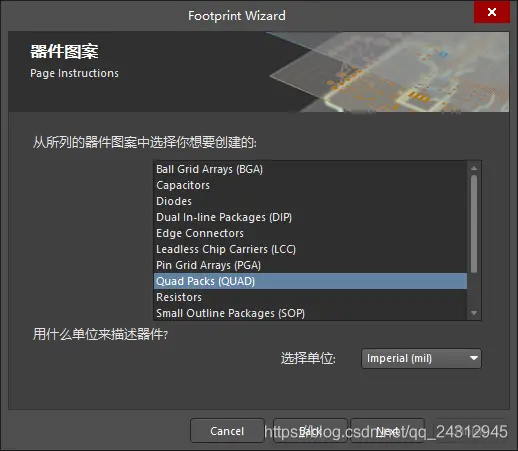 上面可以选择画很多种类的封装,但没有LQFP的封装,我们选一个QUAD的封装进行演示。