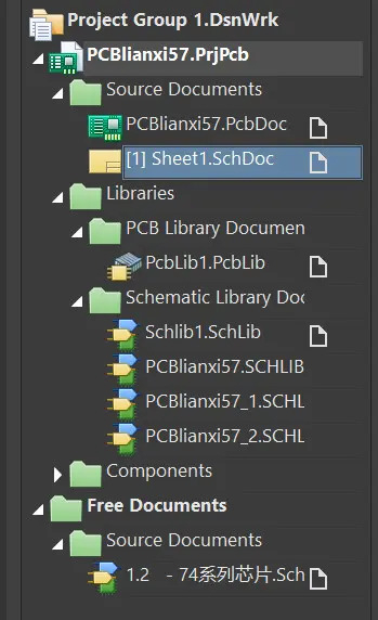 不过课程中老师演示的点击这个按钮之后直接就出现了大量的原理图。可能是因为老师的文件目录里面有一个成品的.schdoc的文件。我没有,所以点完了是这样的。