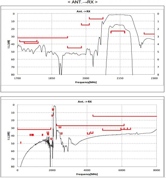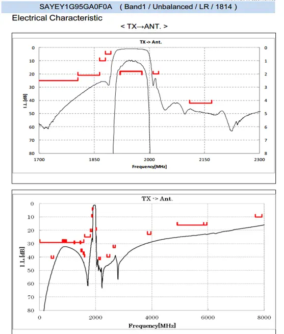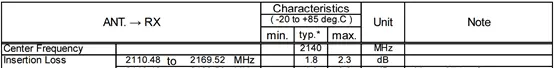 Ø 接收插损,RX Insertion Loss,是指接收带内的发射信号经过双工器以后的损耗,以dB来表示,村田B1双工器典型值为1.5dB;