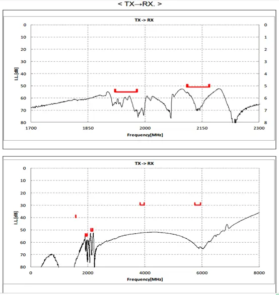 Ø 发射到接收的隔离度,TX Leakage to RX,是指发射引脚的信号泄漏到接收引脚的程度,一般村田和EPCOS双工器的发射接收隔离度在55dB以上;