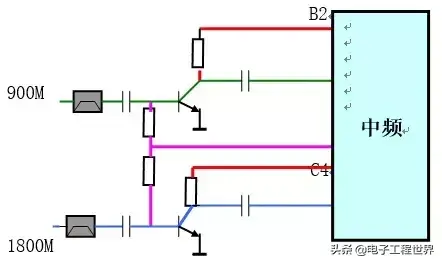 原理:a)、供电:900M/1800M两个高放管的基极偏压共用一路,由中频同时路提供;而两管的集电极的偏压由中频CPU根据手机的接收状态命令中频分两路送出;其目的完成900M/1800M接收信号切换。