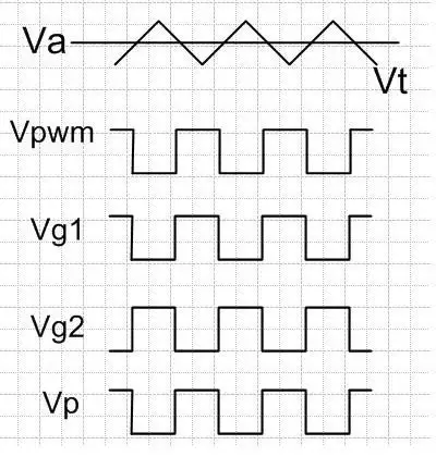 Va高,占空比就低,Va低,占空比就高。经过处理,Vg1与Vpwm同相,Vg2与Vpwm反相;最终L左端的方波电压Vp与Vg1相同。如下图