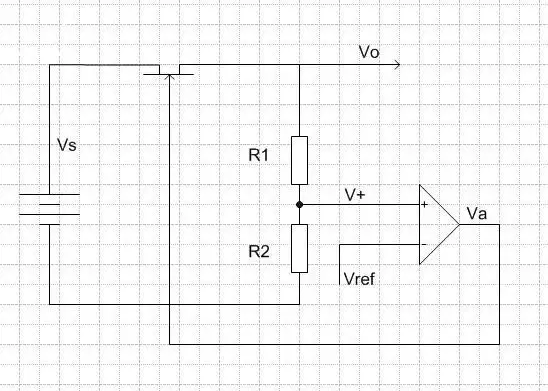 在图中,Vo经过两个分压电阻分压得到V+,V+被送入放大器(我们把这个放大器叫做误差放大器)的正端,而放大器的负端Vref是电源内部的参考电平(这个参考电平是恒定的)。放大器的输出Va连接到MOSFET的栅极来控制MOSFET的阻抗。