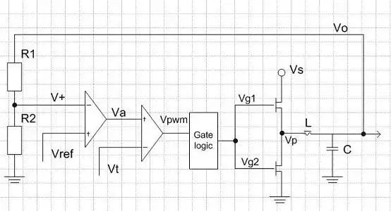 Vo经过R1、R2分压后送入第一个放大器(误差放大器)的负端V+,误差放大器的输出Va做为第二个放大器(PWM放大器)的正端,PWM放大器的输出Vpwm是一个有一定占空比的方波,经过门逻辑电路处理得到两个反相的方波Vg1、Vg2来控制MOSFET的开关。