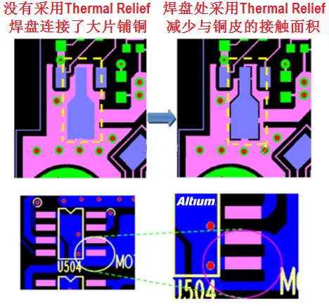 既然知道了问题点就可以有解决的方法,一般我们都会要求采用所谓Thermal Relief pad(热风焊垫)设计来解决这类因为大片铜箔连接元件焊脚所造成的焊接问题。如下图所示,左边的布线没有采用热风焊盘,而右边的布线则已经采用了热风焊盘的连接方式,可以看到焊盘与大片铜箔的接触面积只剩下几条细小的线路,这样就可以大大限制焊垫上温度的流失,达到较佳的焊接效果。