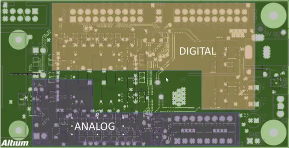 耦合 - 为了减少由于放置了大的地平面以及在其上方和下方走线的电容耦合,请尝试仅通过模拟信号线路交叉模拟地。