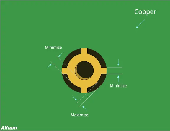 作为一般准则,始终对连接到地平面或电源平面的任何通孔或过孔使用热风焊盘方式连接。除了热风焊盘外,您还可以在焊盘连接线的位置添加泪滴,以提供额外的铜箔/金属支撑。这将有助于减少机械应力和热应力。