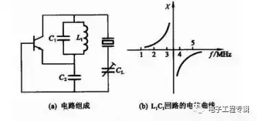 上图中石英晶体与CL支路呈电感特性,以石英晶体、C2以及L1C1回路一起构成三点式振荡器,根据三点式振荡器的组成原则(射同它异),L1C1谐振回路应呈容性。假定图中石英晶体工作在5次泛音频率上,标称频率为5 MHz,为了抑制基频和3次泛音的寄生振荡,L1C1回路应调谐在3次和5次泛音频率之间,即3~5 MHz之间。由图(b)所示的L1C1谐振回路电抗特性曲线可知,对于5次泛音频率5 MHz,L1C1回路呈容性,电路满足三点式振荡条件,可以振荡。对于小于L1C1回路谐振频率的基波和3次谐波,回路呈电感特性,不符合射同它异的组成原则,不能产生振荡。对于7次及7次以上的泛音,虽然L1C1回路也呈容性,但此时的等效电容过大,振幅起振条件不能满足,振荡也无法产生。