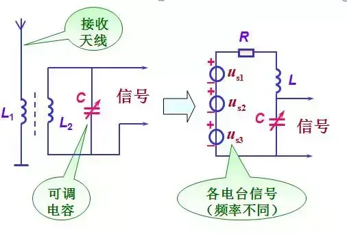 当各种不同频率信号的电波在天线上产生不同频率的电信号,经过线圈1L感应到线圈2L。如果振荡电路对某一信号频率发生谐振时,回路中该信号的电流最大,则在电容器两端产生一高于此信号电压Q倍的电压CU。而对于其它各种频率的信号,因为没有发生谐振,在回路中电流很小,从而被电路抑制掉。所以,可以改变电容C,以改变回路的谐振频率来选择所需耍的电台信号。