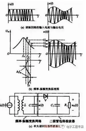 以斜率鉴频器为例,如图所示,图(a)是谐振回路的输入电流与输出电压。图(b)是其中的频率一振幅变换原理。图(c)为单失谐回路鉴频器原理图。