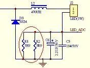 再来看上面的电路,如果我们把R4和R5合并成一个1/4W 1M的插件电路,功率上讲是没有问题的,但是230V交流通过整流桥后可以产生最高325V的直流电压,这样就会让这个电阻长时间工作在300V左右的电压下,时间一长,就会损坏这个电阻,但如果是用两个510K的电阻串联,每个电阻只分到大约150V的电压,就可以保证电路长时间稳定工作。