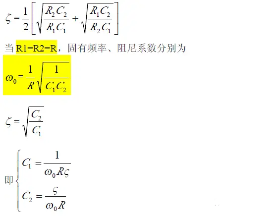 可见该低通滤波器特点是阻尼系数ζ 由电阻R1、R2,C1、C2 的比决定;而固有频率ω0与R1、R2、C1、C2 具体数值有关,即ω0与ζ 独立可调,互不影响。