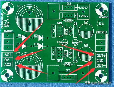 如上图所示箭头所示,AC1,OV,AC2, OUT+,GND,OUT-等等,这些标记好了,对于生产,调试人员都有一个可视感,很方便。这些标识不用太详细,能让调试人员能识别就可。