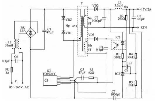 1、振荡回路 开关变压器的主绕组N1、Q1的漏--源极、R2(工作电流检测电阻)为电源工作电流的通路;本机启动电路与其它开关电源(启动电路由降压限流电阻组成)有所不同,启动电路由C5、D3、D4组成,提供一个“瞬态”的启动电流,二极管D2吸收反向电压,D3具有整流作用,保障加到U1的7脚的启动电流为正电流;电路起振后,由N2自供电绕组、D2、C5整流滤波电路,提供U1芯片的供电电压。这三个环节的正常运行,是电源能够振荡起来的先决条件。