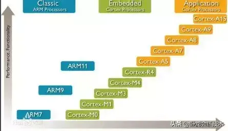 比如arm公司有各种各样的处理器架构,最经典的cortex系列,它属于ARMv7架构,这是到2010年为止ARM公司最新的指令集架构。ARMv7架构定义了三大分工明确的系列:“A”系列面向尖端的基于虚拟内存的操作系统和用户应用;“R”系列针对实时系统;“M”系列对微控制器。下图就是cortex系列的不同定位。