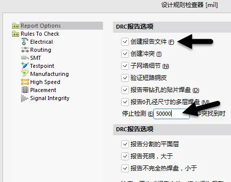 ② 停止检测50000冲突找时:表示当系统检测到50000个DRC报错的时候直接停止再检查,系统默认设置一般是500,但是设置到500时有些DRC会进行显示,有些DRC不会进行显示,只有修正已存在的错误,再次DRC的时候才会显示,这样对于大板设计非常不方便。