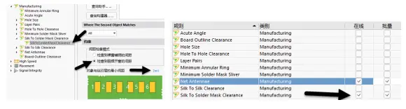 阻焊是防止绿油覆盖的区域,会出现露铜或者露基材的情况,当丝印标识放置到这个区域时,会出现缺失的情况,需要对丝印上阻焊进行例行检查,如图11-9所示,需要对其规则进行设置,并且勾选DRC检查选项。