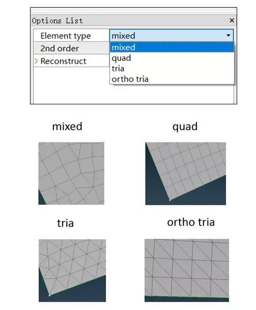 使用STL网格划分算法对区域面进行网格划分,其对单元的质量不是很看重,但是需要精确地表示原始几何数据,即该算法不会破坏原来的几何结构。对于上述各个算法的网格划分,用户均需有一定的理解,并在网格划分时按照特定的要求选择一个或者多个算法来完成数据的网格划分。在进行网格划分时,通常在右下角的【Option List】中会有对单元种类的选择,一般来讲有以下四种类型(混合型、三角形、四边形、和对角三角形),需要使用者额外注意。
